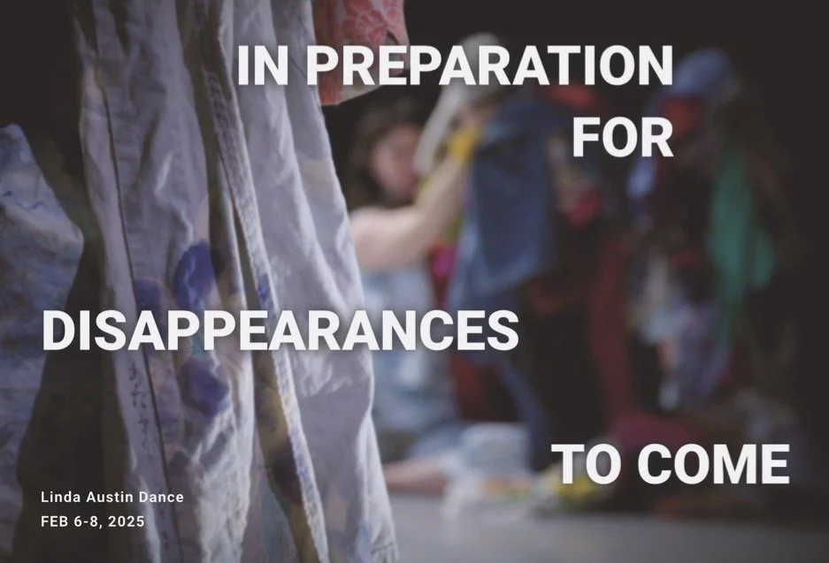 In Preparation for Disappearances to Come Directed by Linda Austin, Co-Choreographed by Danielle Ross and Allie Hankins, Performed by Austin, Ross & Hankins Sound by Kevin Bud Jones & Chris Cochrane Thursday, February 6th - Saturday, February 8th at 7:30p, matinee at 2p on Saturday, February 8th Portland Institute for Contemporary Art, 15 NE Hancock, 97232 Tickets and information here